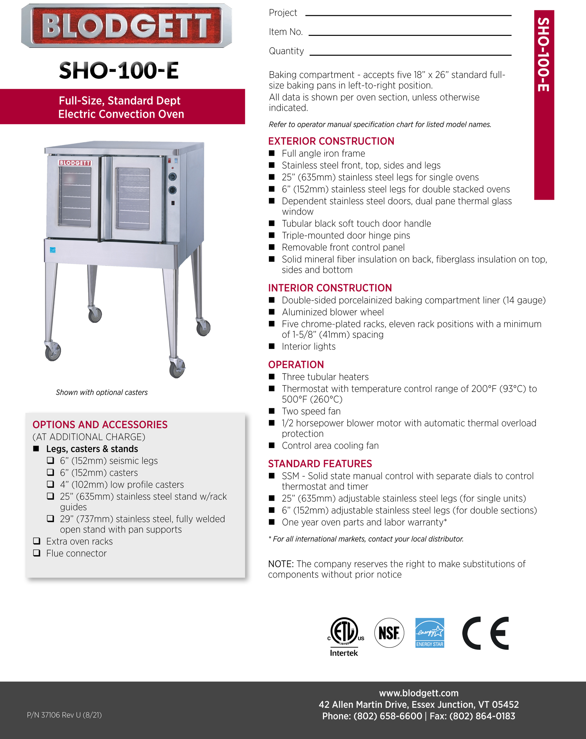 | SHO-100-E | Blodgett Convection Oven (Electric Type) |