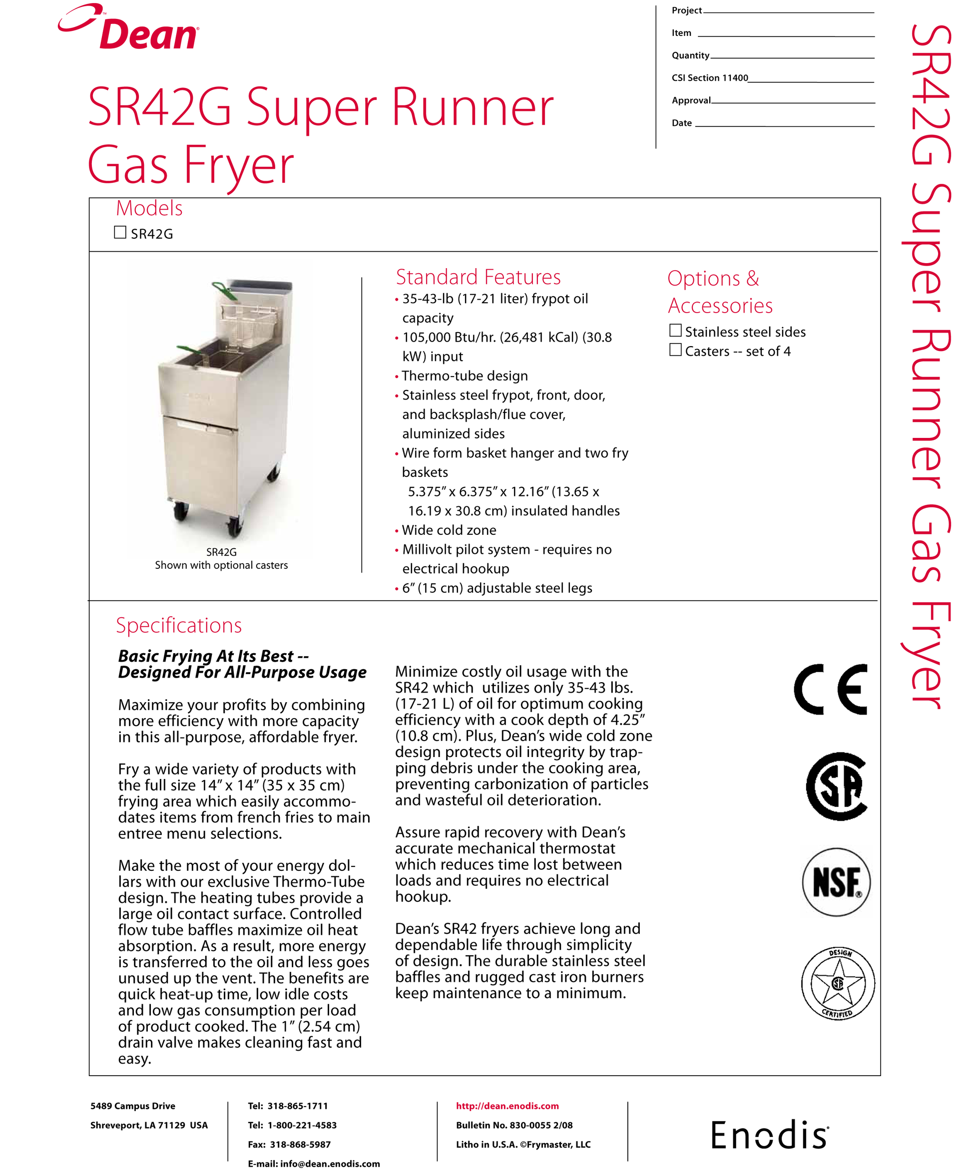 Fry a wide variety of products with Dean’s Super Runner fryers which easily accommodate items from French fries to main entree menu selections. The fryers are available in three oil capacities utilizing 43 lbs., 50 lbs. and 75 lbs. of oil. Make the most of your energy dollars with Dean’s exclusive Thermo-Tube design. The heating tubes provide a large oil contact surface. Flow-tube baffles control the transfer of heat into the oil. Dean’s wide cold zone frypot protects oil integrity by trapping debris under the cooking area, preventing carbonization of particles and wasteful oil deterioration. Dean’s durable temperature probe assures prompt recovery which reduces time lost between loads and requires no electrical hookup. Dean’s Super Runner gas fryers achieve dependability through simplicity of design, durable stainless steel baffles and rugged cast iron burners.