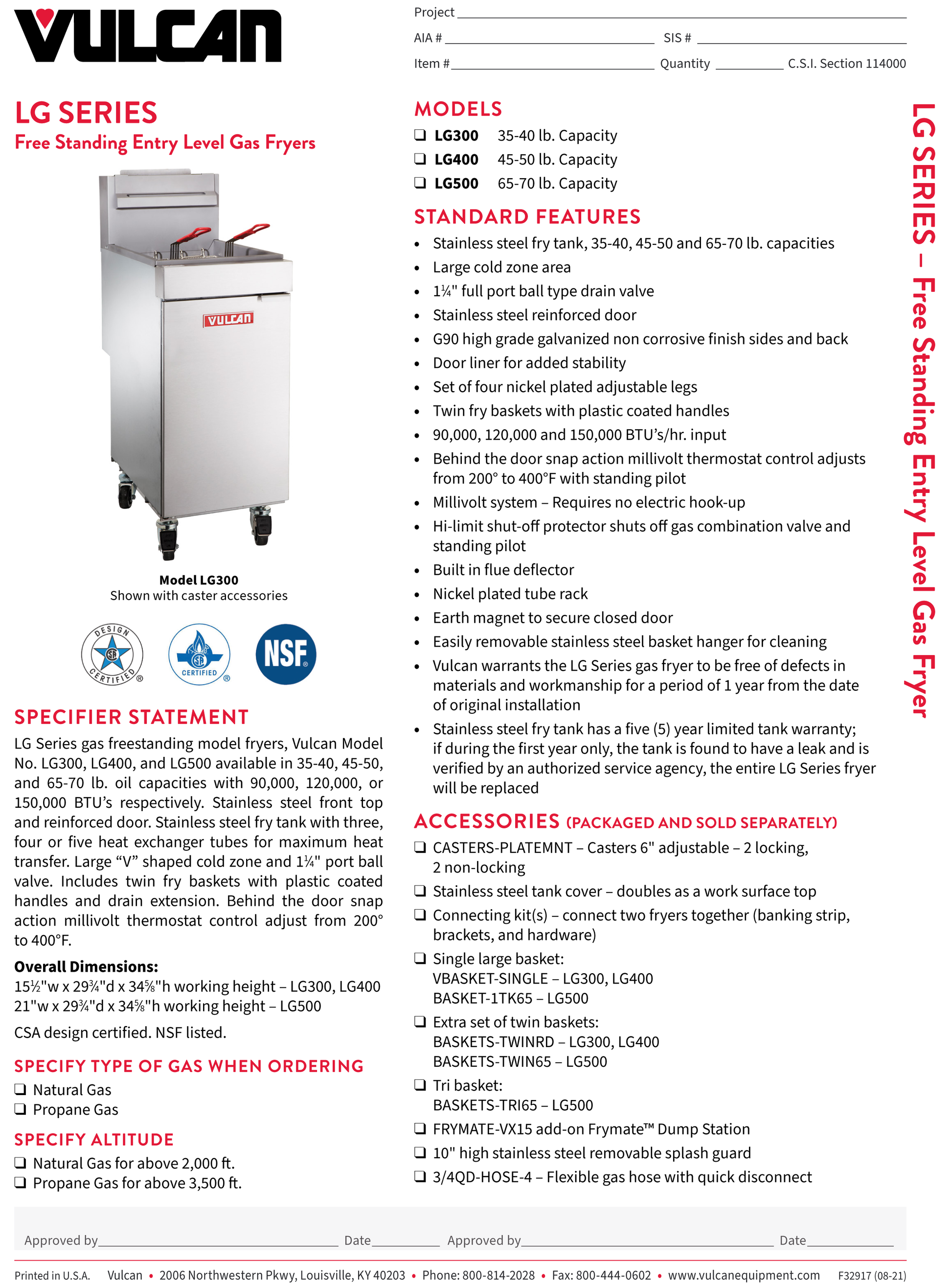 - Easily removable stainless steel basket hanger for cleaningVulcan warrants the LG Series gas fryer to be free of defects in materials and workmanship for a period of 1 year from the date of original installation