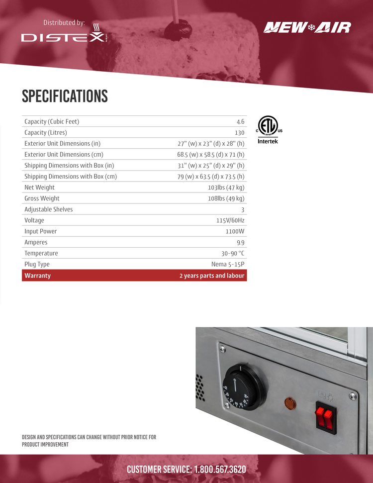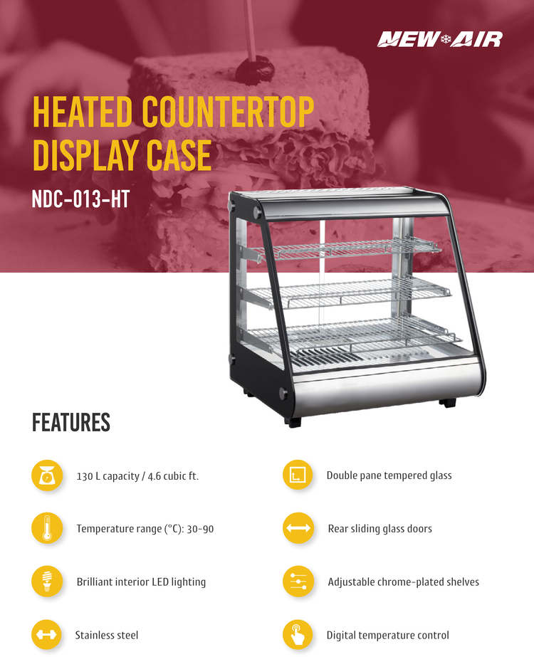 The New Air NDC-013-HT is a countertop heated display case that is 27" wide and gives you 4.6 cubic feet of heated space. It features bright LED lighting and adjustable chrome-plated shelves. It has a sleek design with digital temperature display. It's perfect for increasing those impulse purchases.