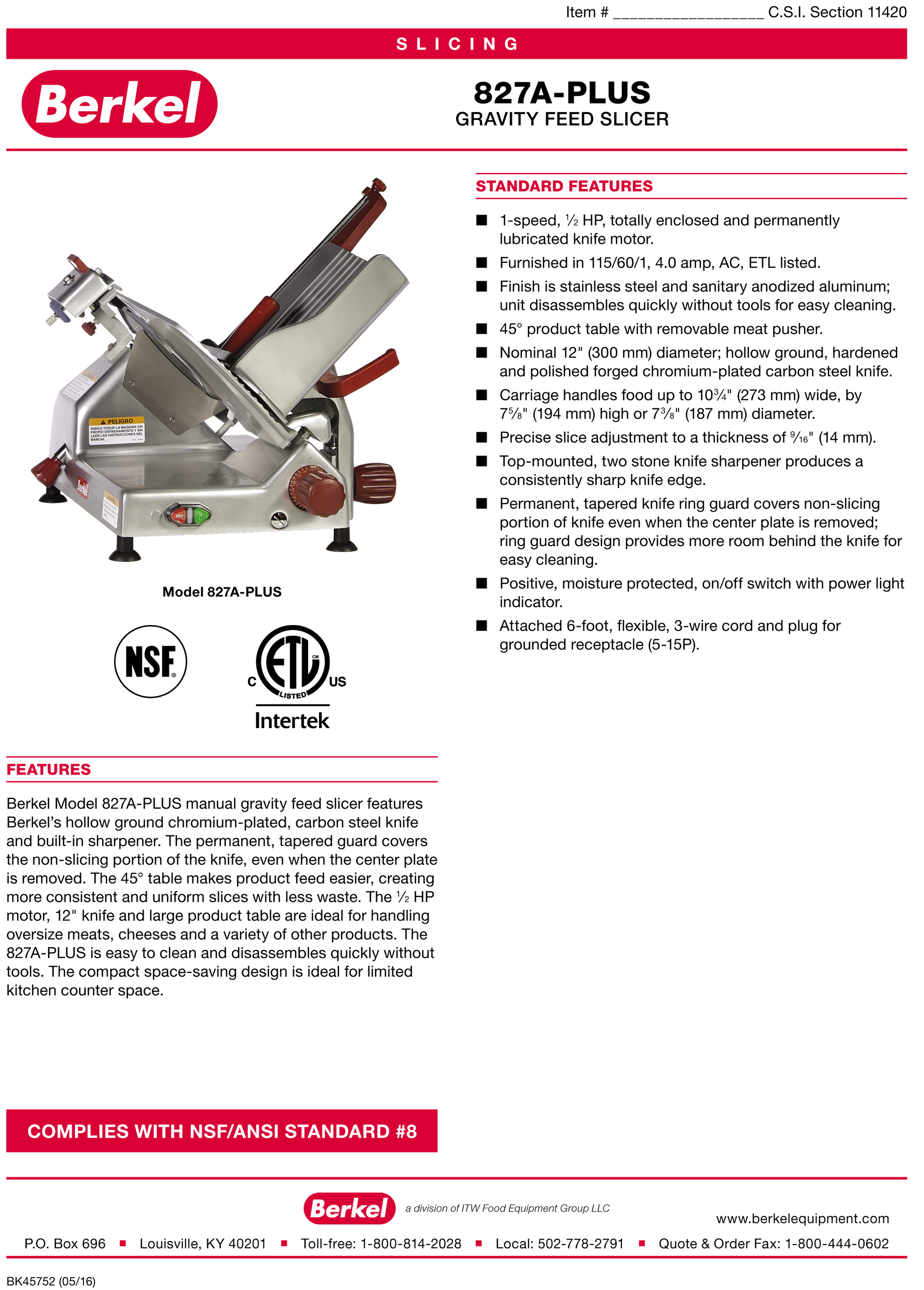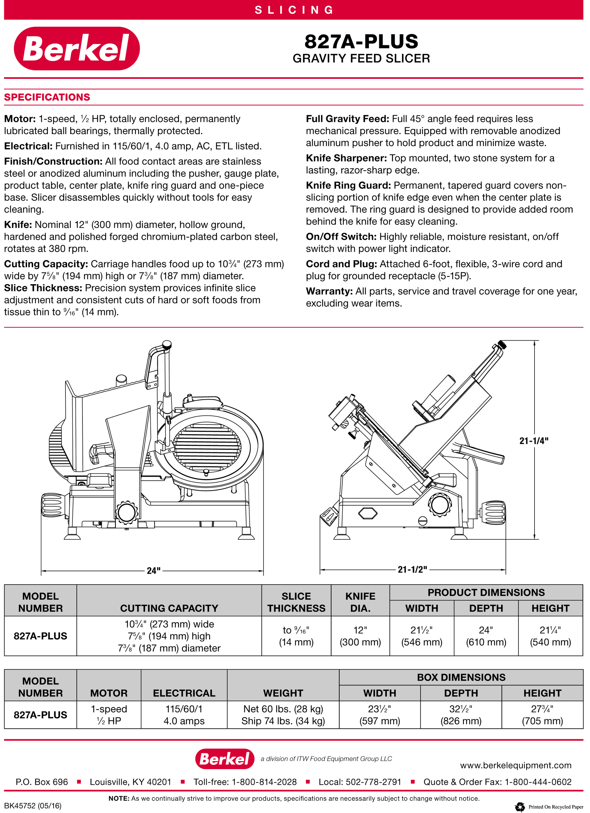 Berkel Model 827A-PLUS manual gravity feed slicer features Berkel’s hollow ground chromium-plated, carbon steel knife and built-in sharpener. The permanent, tapered guard covers the non-slicing portion of the knife, even when the center plate is removed. The 45° table makes product feed easier, creating more consistent and uniform slices with less waste. The 1⁄2 HP motor, 12" knife and large product table are ideal for handling oversize meats, cheeses and a variety of other products. The 827A-PLUS is easy to clean and disassembles quickly without tools. The compact space-saving design is ideal for limited kitchen counter space.