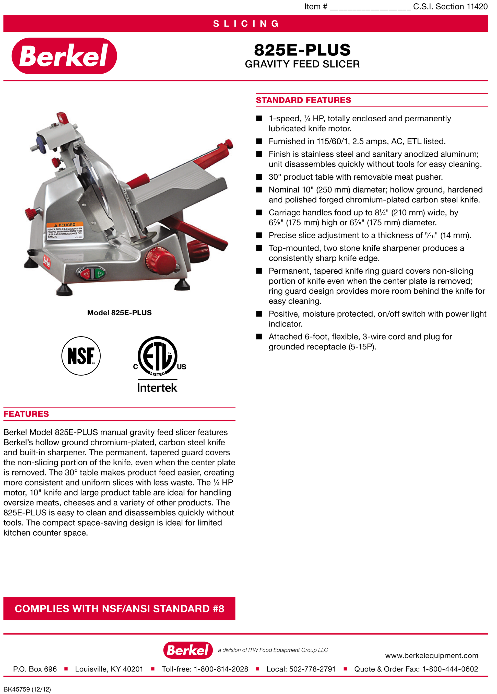 Berkel Model 825E-PLUS manual gravity feed slicer features Berkel’s hollow ground chromium-plated, carbon steel knife and built-in sharpener. The permanent, tapered guard covers the non-slicing portion of the knife, even when the center plate is removed. The 30° table makes product feed easier, creating more consistent and uniform slices with less waste. The 1⁄4 HP motor, 10" knife and large product table are ideal for handling oversize meats, cheeses and a variety of other products. The 825E-PLUS is easy to clean and disassembles quickly without tools. The compact space-saving design is ideal for limited kitchen counter space.