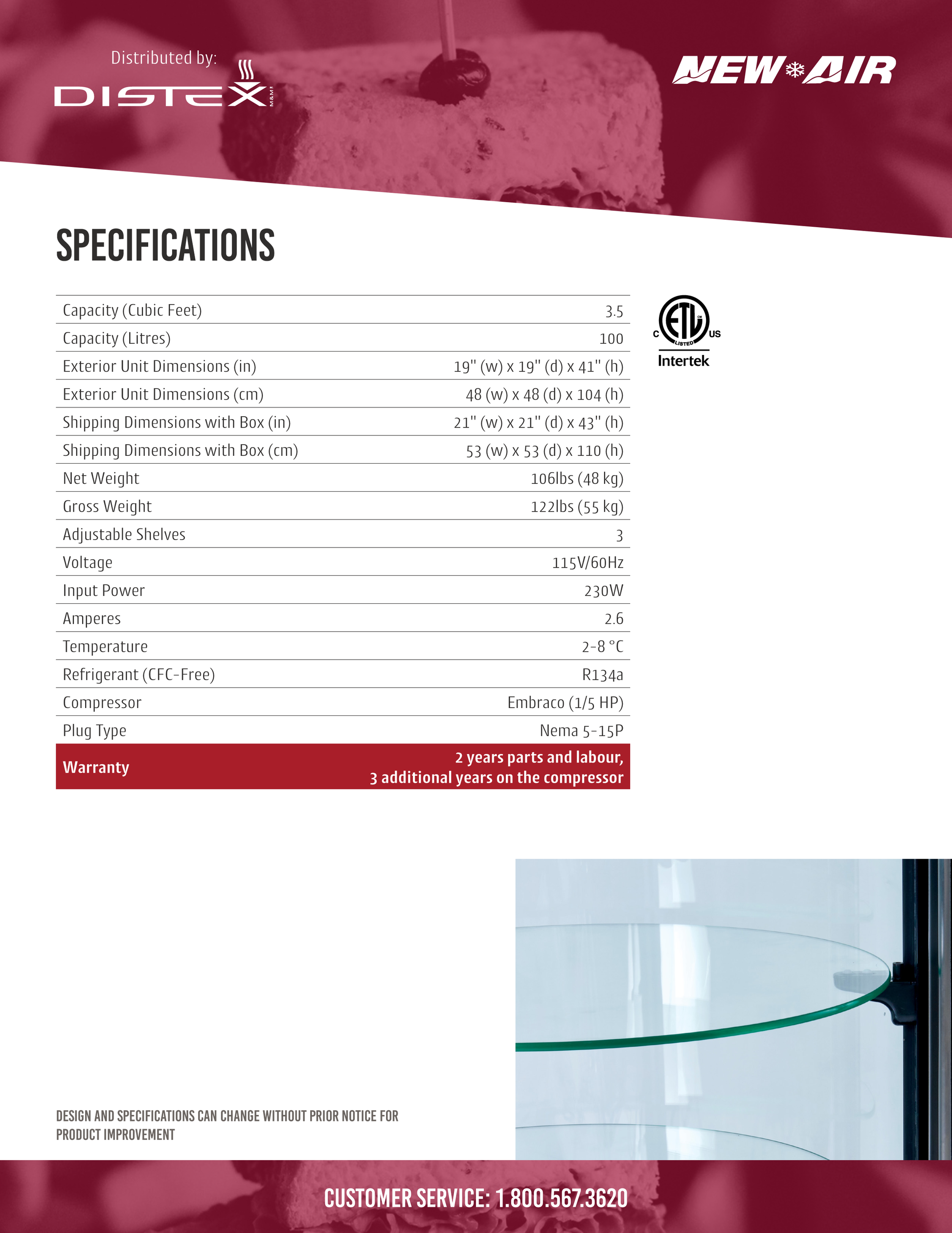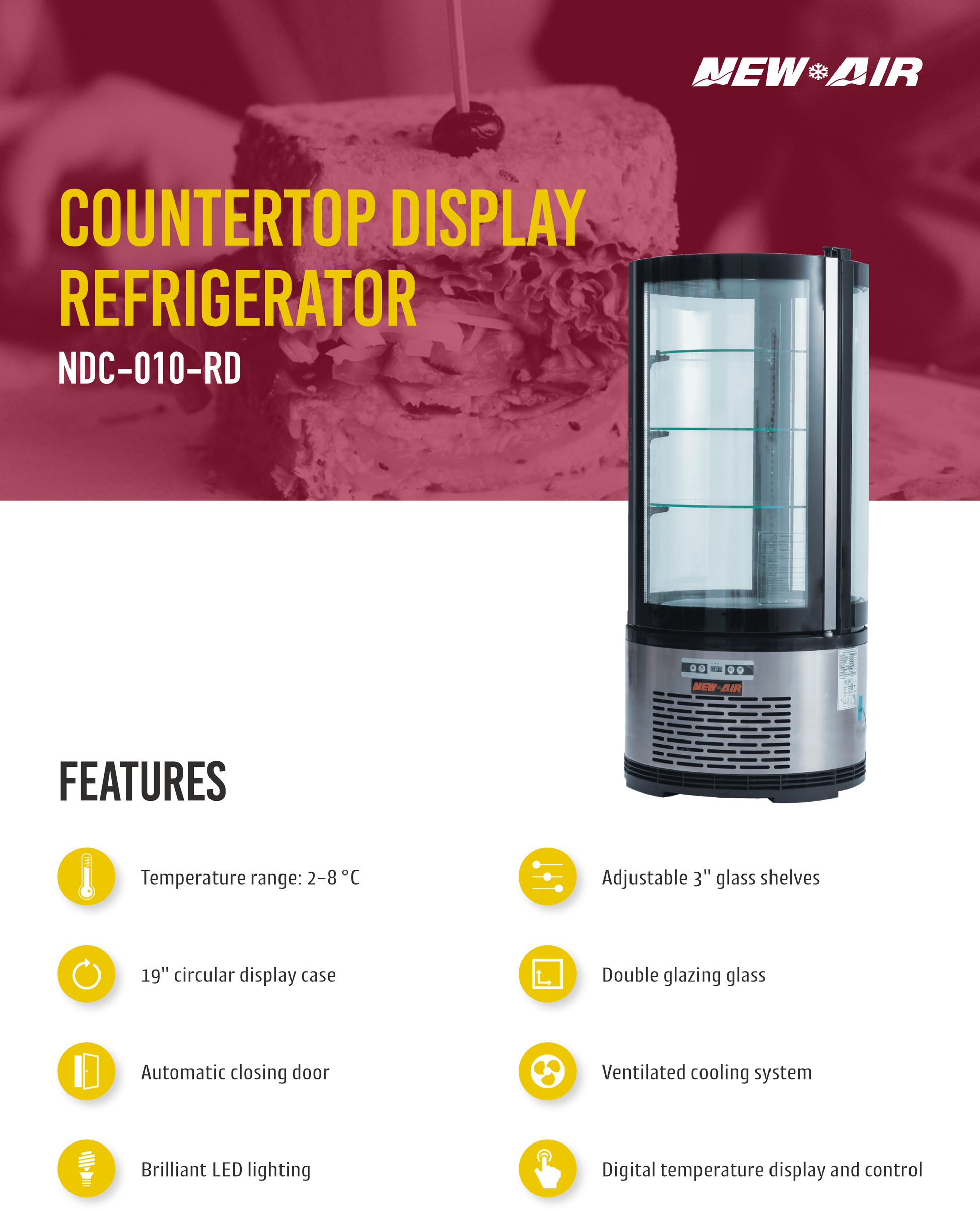 The New Air NDC-010-RD is a stylish refrigerated display case, with a round design that makes it perfect for cakes or other baked goods. It's only 19" wide and will fit on your countertop, right at eye-level with your customer. It has bright LED lights on both sides and an automatic defrost system.