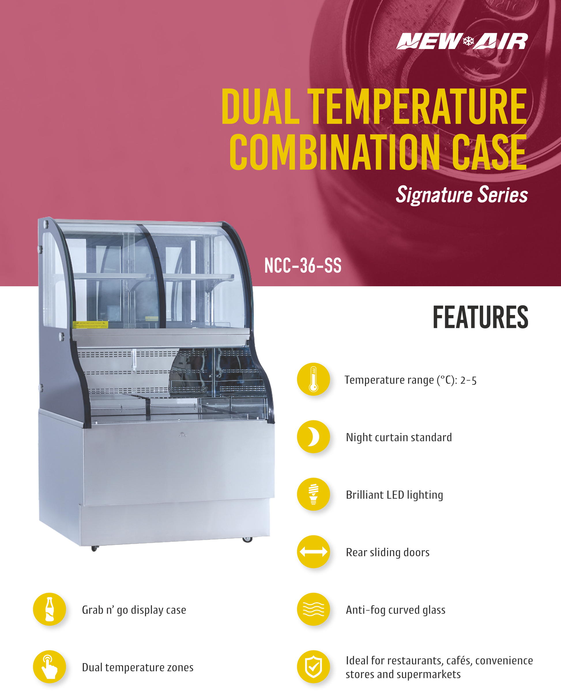 The New Air NCC-36-SS is a floor-model dual temperature display case that is 36" wide and gives you 12.5 cubic feet in the upper cabinet, and 6 cubic feet in the lower cabinet. This is a Starbucks style dual service case. It features bright LED lighting and anti-fog curved glass, which is perfect for showing off your products. It also has a sleek and durable design with dual temperature display.