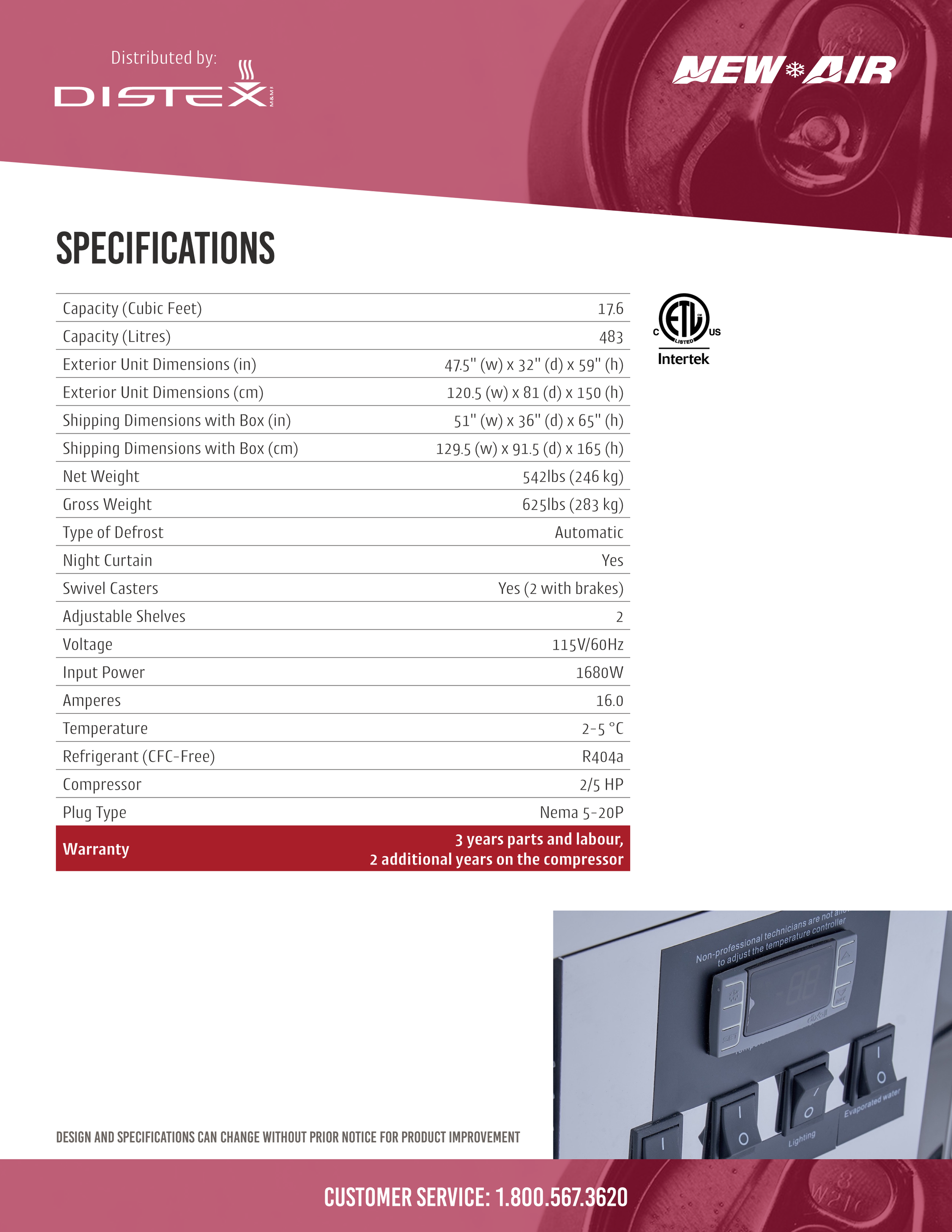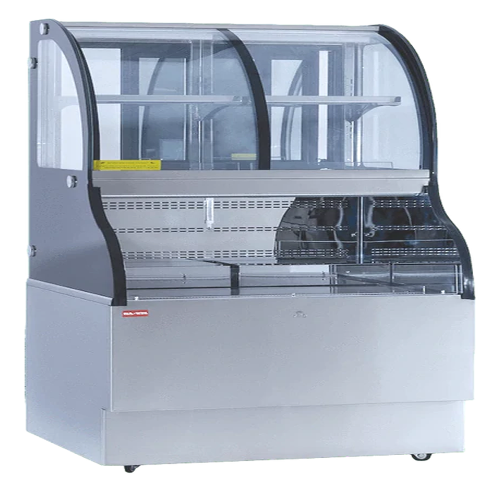 The New Air NCC-48-SS is a floor model, dual temperature display case that is 47.5" wide and gives you 17.6 cubic feet of space between both the upper and lower shelves. This is a Starbucks style dual service case. It features bright LED lighting and anti-fog curved glass, which is perfect for showing off your products. It also has a sleek and durable design with dual temperature display.