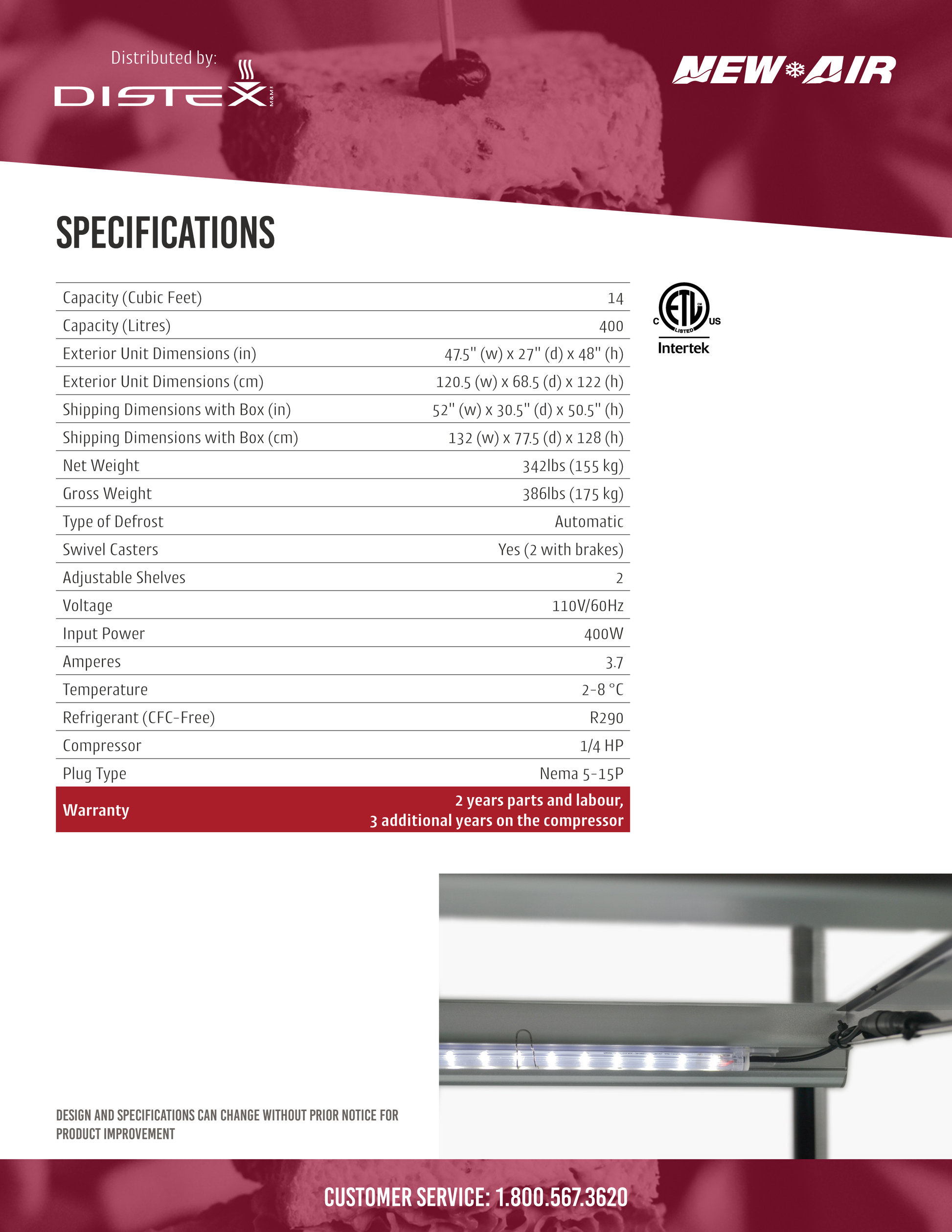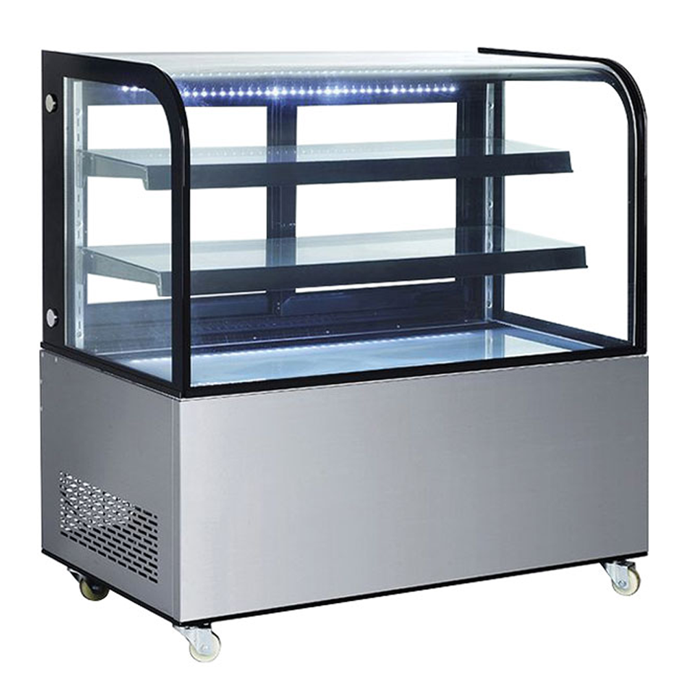 The New Air NDC-017-CG is a floor-model refrigerated display case that is 59.25" wide and gives you 17.5 cubic feet of refrigerated space. It features bright LED lighting and two, adjustable glass shelves. It has a sleek design and automatic defrost. It's perfect for displaying cake and other baked goods to your customers.