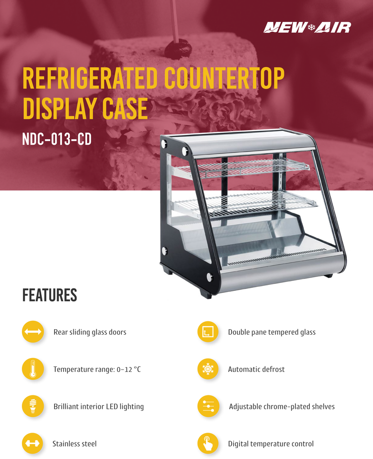 Prominently display a selection of sandwiches, desserts, snacks, and other products right on your counter with the New Air 28" Refrigerated Countertop Display Case.