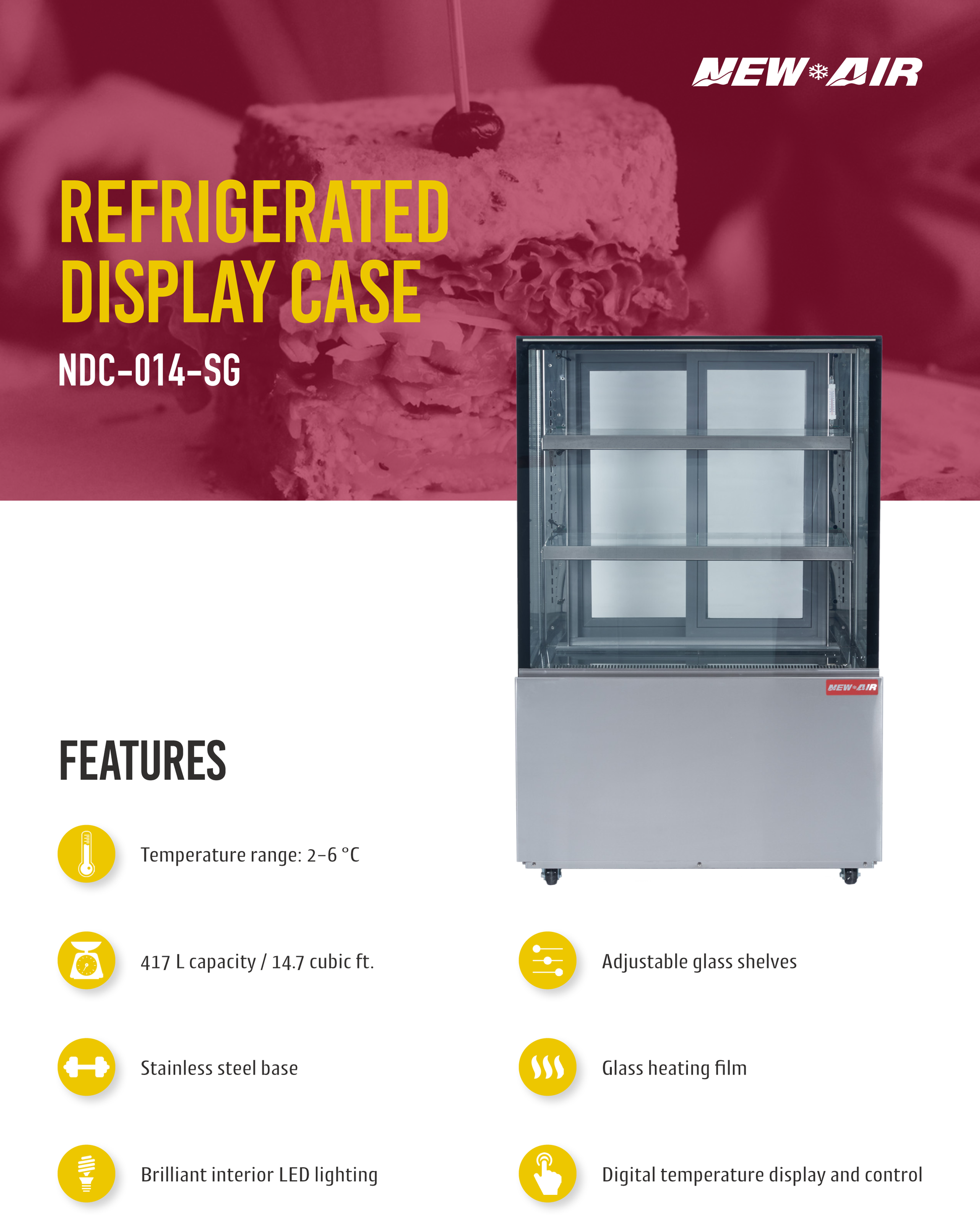 The New Air NCD-014-SG is a floor-model full service refrigerated display case that is 35.5" wide and gives you 14.5 cubic feet of refrigerated space. It features a strong, stainless steel base with a digital temperature display. It is perfect for displaying your bakery products!