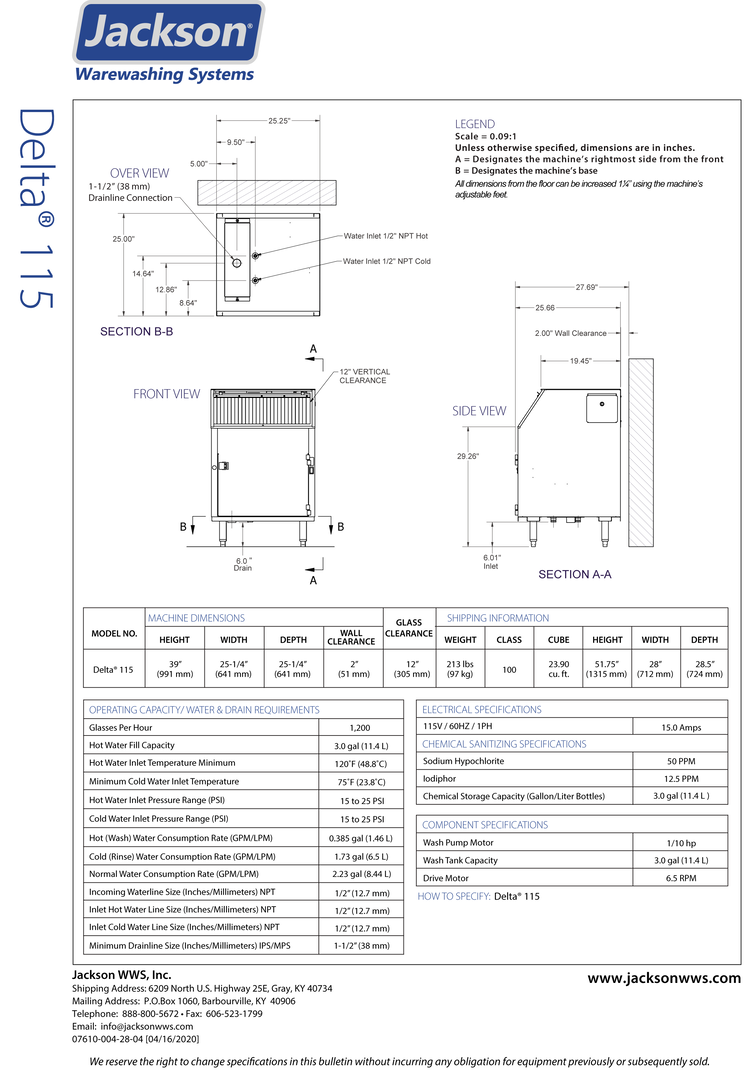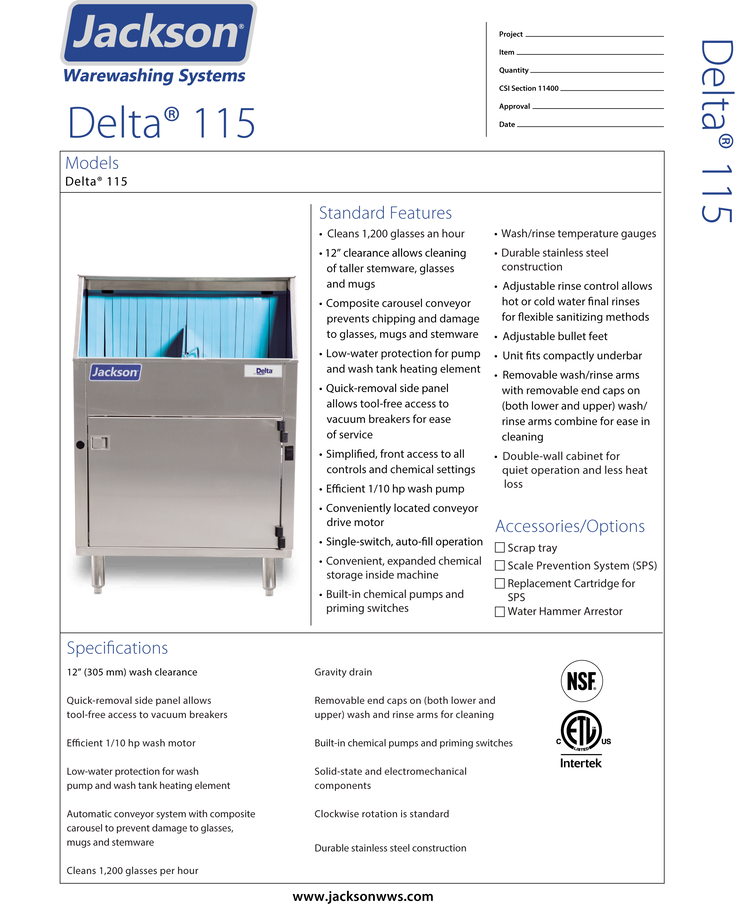 The Delta 115 is the 115 volt version of our Delta 1200. It cleans 1200 glasses per hour on a carousel conveyor that prevents glassware chipping. It features a 12″ clearance that accommodates taller glasses and stemware, plus stainless steel construction of wash arms, rinse arms and manifold. This must-have glasswasher includes built-in chemical pumps, onboard chemical storage, and a stainless steel scrap screen.