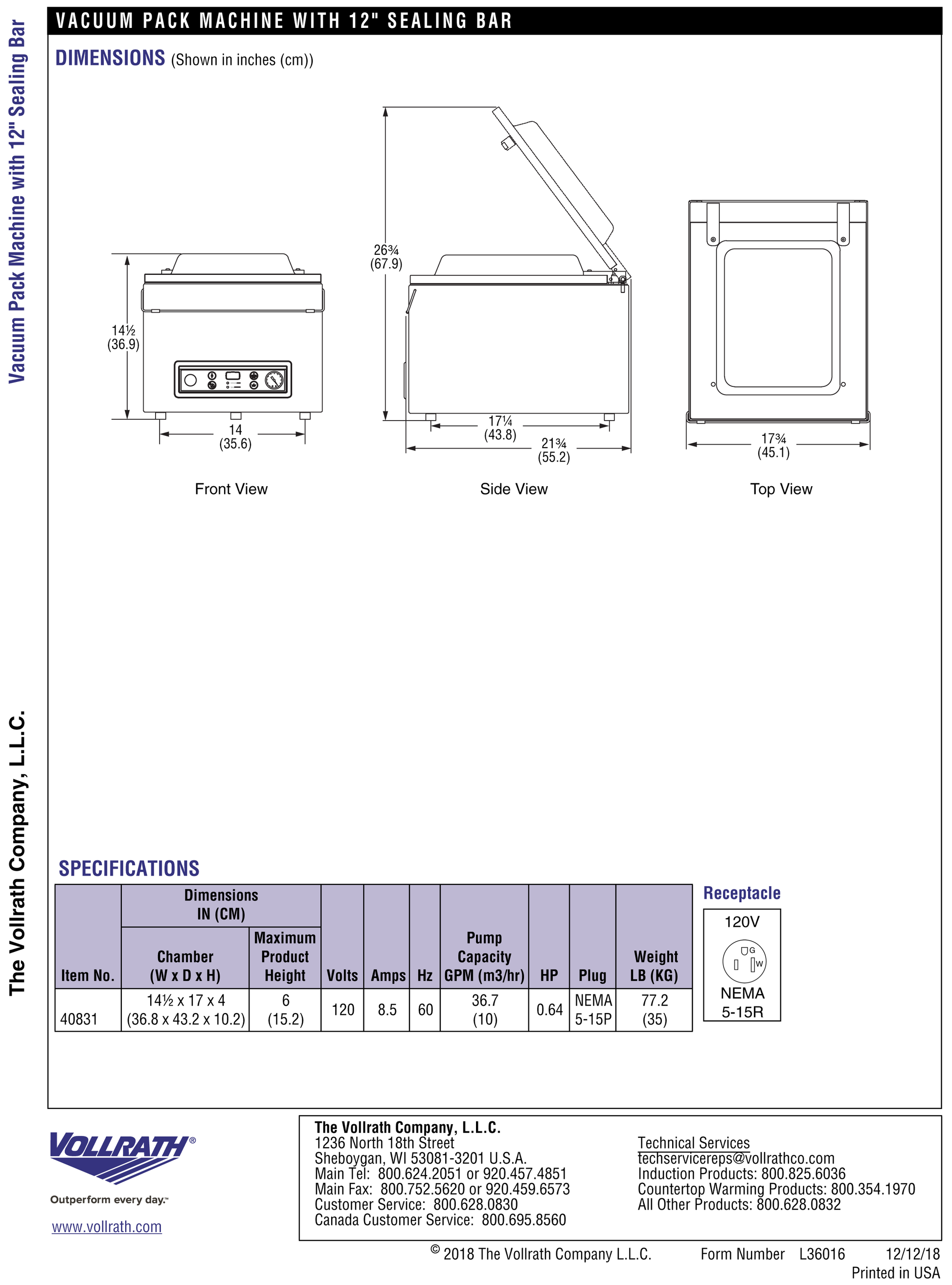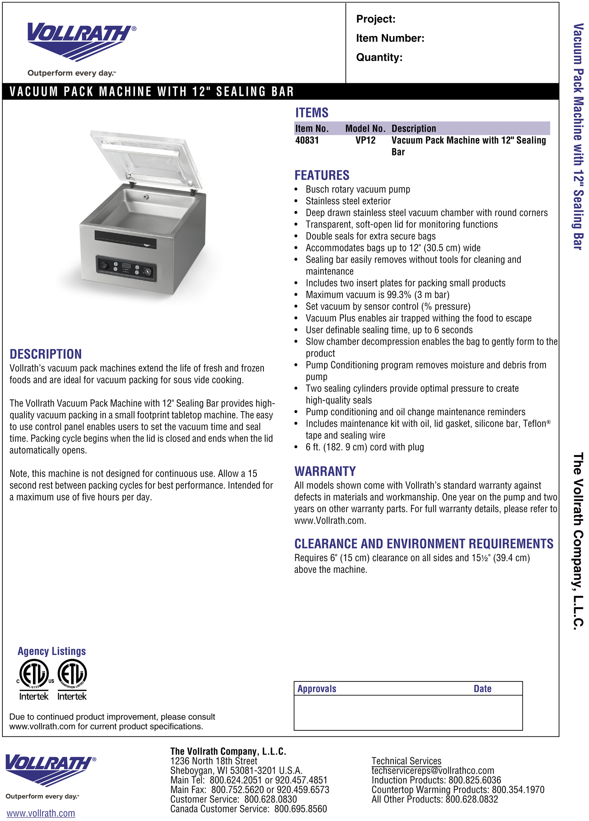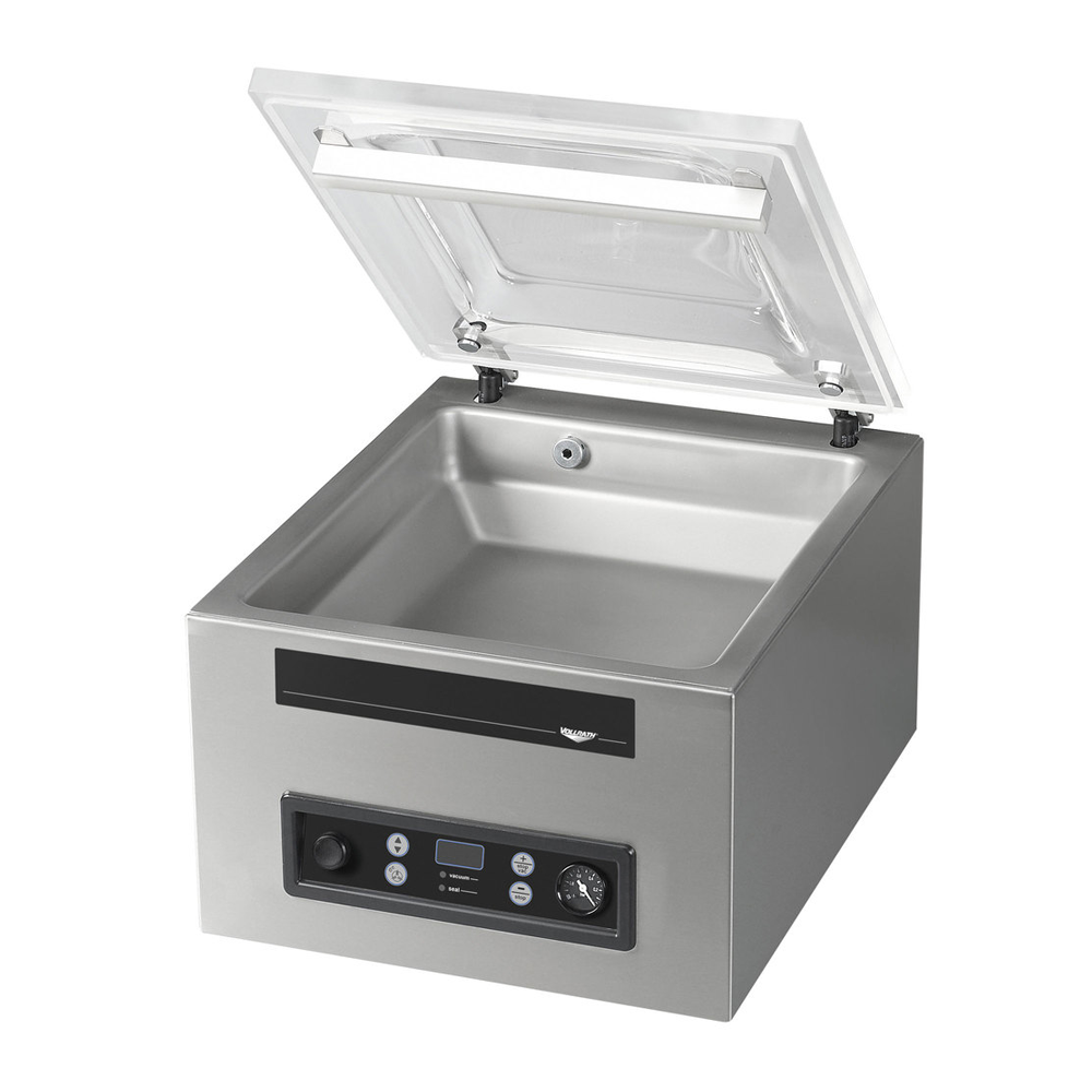 Reduce waste and extend the shelf life of your food with the Vollrath® medium in-chamber vacuum-pack machine. This unit has a smooth, stainless steel exterior and a transparent, soft-open lid for ease of use. The customizable front panel controls allow you to set the desired vacuum time. The strong sealing cylinders create a tight seal, while the seal bar accommodates multiple bags up to 12 inches. The seal bar is also easy to remove and clean, while the pump-conditioning program removes unwanted moisture and debris. Both of these features extend the life of the unit and ensure high-quality vacuum sealing. Vollrath’s vacuum pack machines extend the life of fresh and frozen foods and are ideal for vacuum packing for sous vide cooking. The Vollrath Vacuum Pack Machine with 12" Sealing Bar provides highquality vacuum packing in a small footprint tabletop machine. The easy to use control panel enables users to set the vacuum time and seal time. Packing cycle begins when the lid is closed and ends when the lid automatically opens. Note, this machine is not designed for continuous use. Allow a 15 second rest between packing cycles for best performance. Intended for a maximum use of five hours per day.